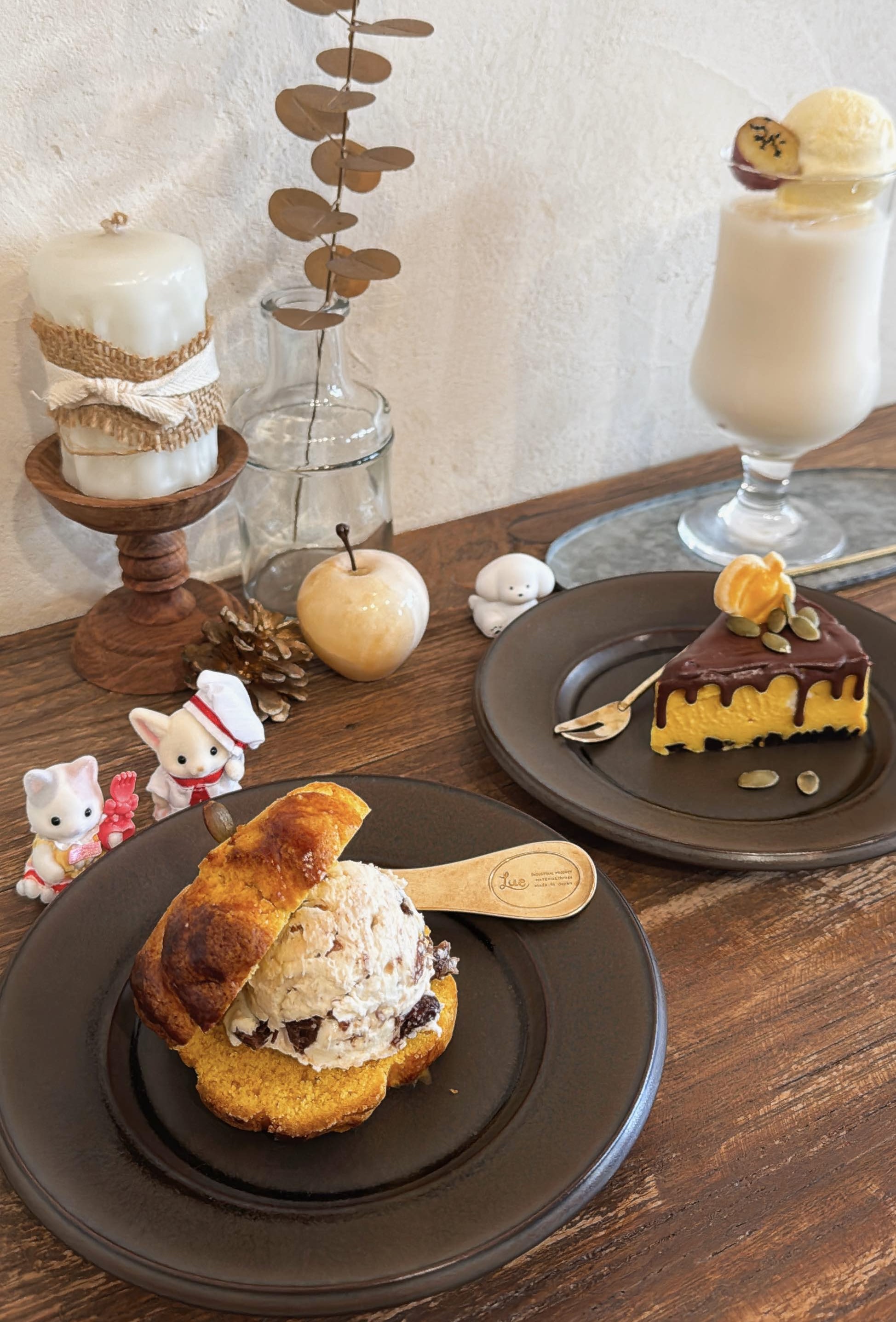 かぼちゃのチーズケーキとかぼちゃのスコーンです あと安納芋のロイヤルミルクティーフロート