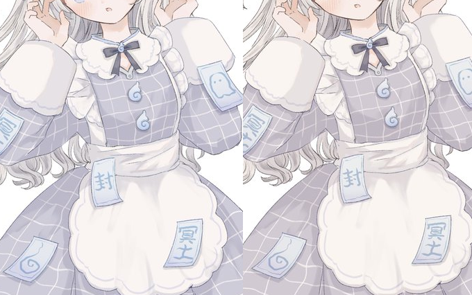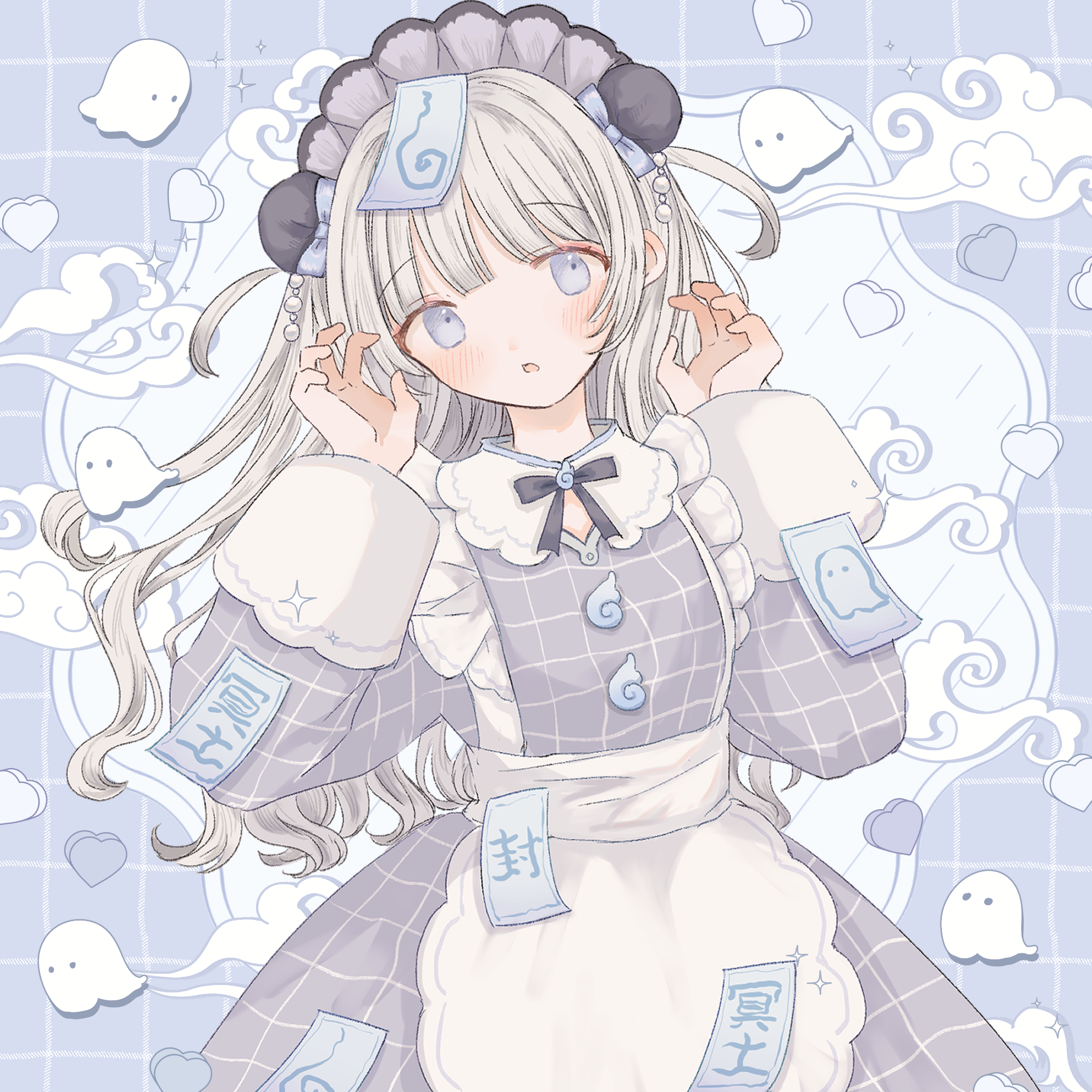 袖大きめ+薄紫に白チェックラインのメイド服可愛いだろうな~というところから気づいたらキョンシーっぽいおばけっぽい要素が追加されてて自分でもそうなるんだ~って他人事みたいに進めていた絵