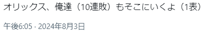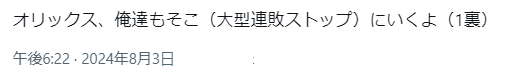 202408040410021-admin.png1裏後のツイート(オリックスさんが10連敗ストップして勝利していた)