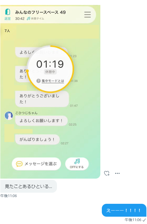 別に入室時の挨拶なんて誰も見てないし私も見てないんだけど、ついなんとなく挨拶ボタン押しちゃうね 自分がこれだけ作業部屋いたんだな~っていうタイムスタンプにもなるし…