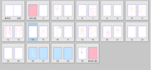 28Pくらいにはしたいな~と思ってるんだけど、ページが全部埋まるほどの構図が浮かんでいなかった…のでまだまだ白紙部分がある