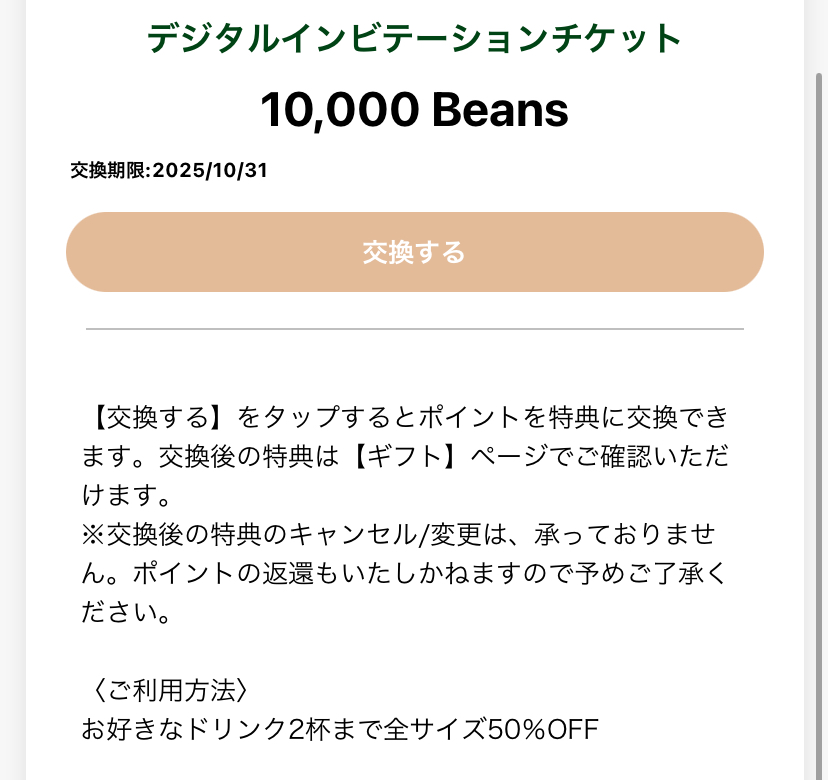 ちなみに10000pt貯まるとドリンク50%引き券がもらえる