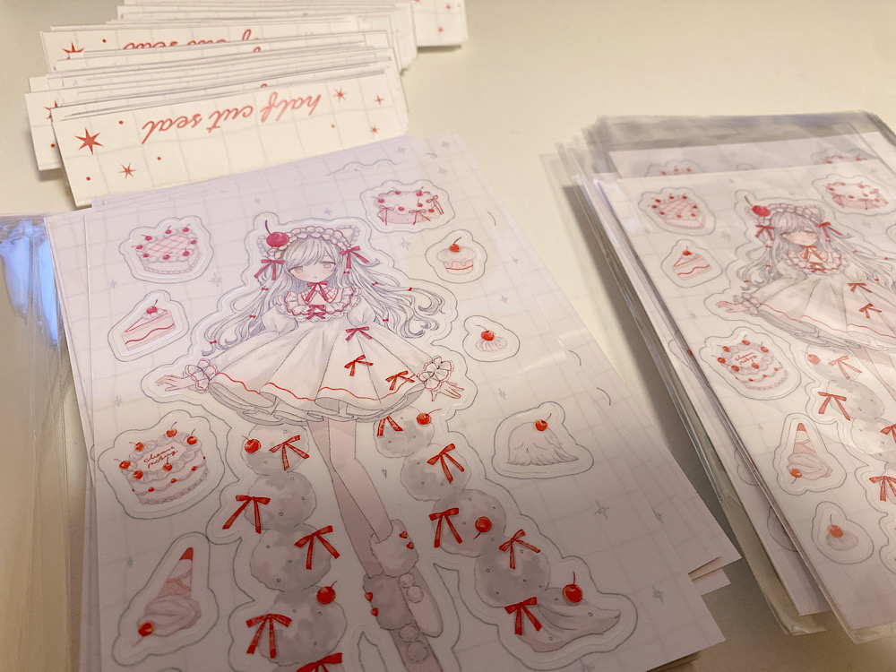 再版したシールを切ったり詰めたりしている